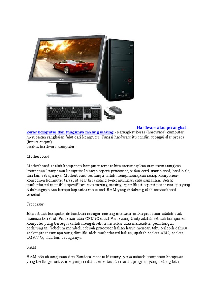 Alat output (keluaran) perangkat keras komputer yang berfungsi sebagai alat keluaran (output) di antaranya adalah monitor, speaker, dan printer. Dalam hal ini, monitor berfungsi sebagai perangkat output penyusun sebuah komputer dan sebuah komputer takkan bisa digunakan jika monitornya tidak ada. Macam perangkat keras komputer yang pertama adalah monitor. Media penyimpanan data sementara yang paling dekat dengan prosesor. Monitor terdiri dari sirkuit, catu daya, tombol untuk menyesuaikan pengaturan layar, dan casing untuk menampung semua komponen tersebut. Untuk para gamers, mungkin bisa merasakan perbedaan 240hz, 144hz dengan 120hz saat main fps. Monitor monitor berfungsi untuk menampilkan visualisasi hasil dari semua operasi yang terjadi di dalam cpu. Berikut adalah contoh perangkat keras input tersebut: Hardware jenis ini adalah perangkat yang digunakan untuk memasukkan data ke dalam komputer.
